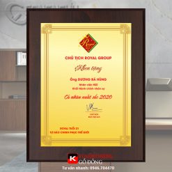 Bảng vàng vinh danh nhân viên, kỷ niệm chương gỗ đồng dùng tri ân, làm từ khung gỗ, kim loại. Nội dung theo thiết kế của khách hàng. Dòng sản phẩm phù hợp tặng nhân viên, lãnh đạo. khách hàng, hội nghị khách hàng. Bảng vàng vinh danh nhân viên với mẫu mã rất đa dạng, kích thước riêng theo yêu cầu của khách hàng.